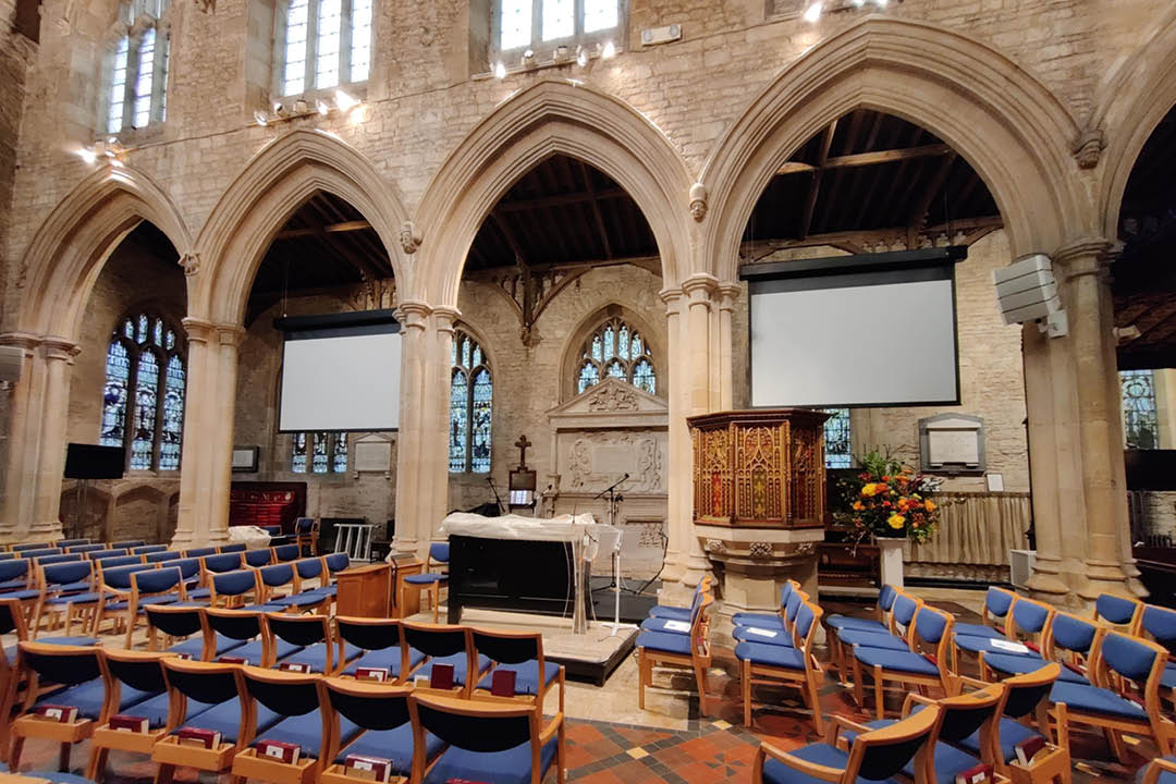 Projection is where APi Sound and Visual can shine brighter than our peers, with custom solutions which accommodate the often challenging logistics of installing a large projection screen into an historic building. Our swing-out screen arm, โup and overโ screen as well as a winch-down screen are all ways in which we can install a church projection system in even the most restrictive of spaces, all while maintaining a minimal visual impact on the aesthetics of the building.